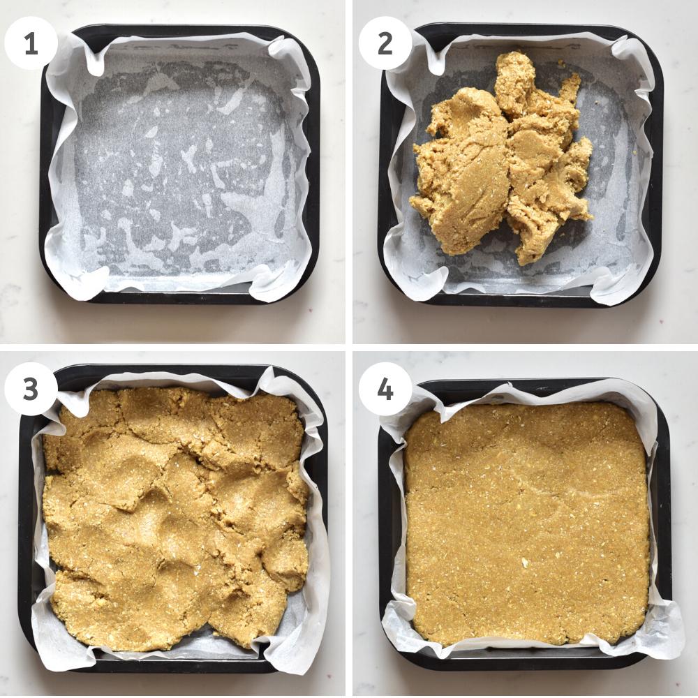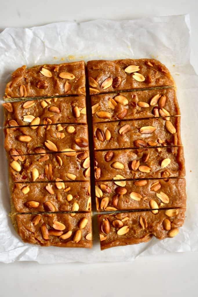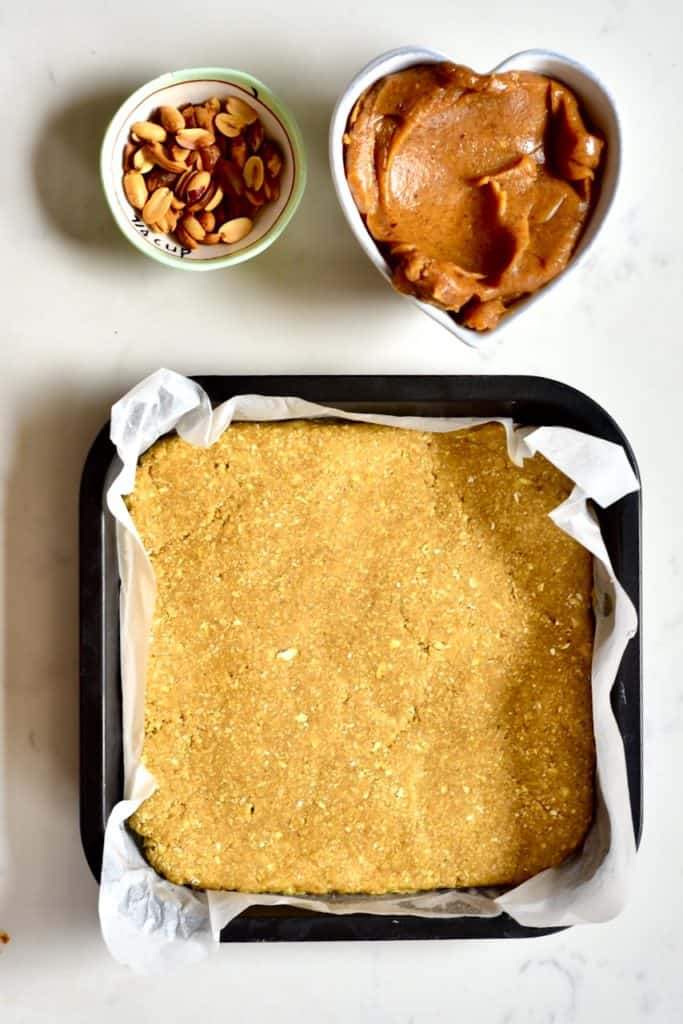 - Prepare the nougat layer first by processing the oats in a blender to get flour and then mixing in the rest of the nougat ingredients. Mix till thoroughly incorporated.