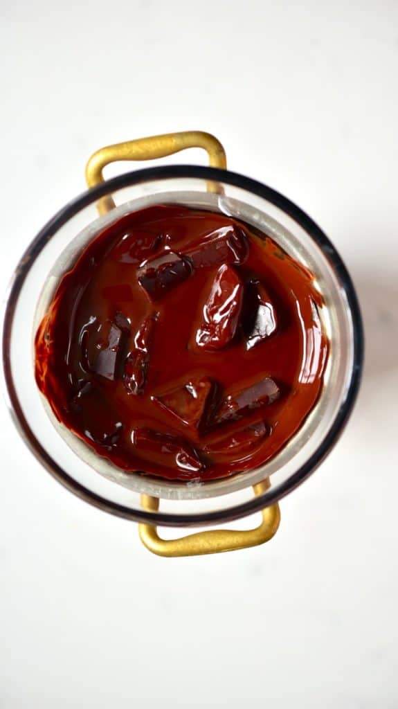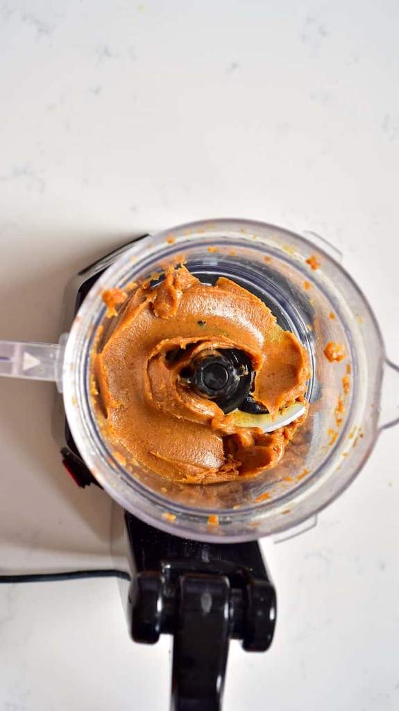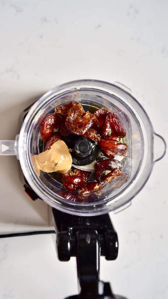 - Add the dates and the rest of the date caramel layer ingredients (without the peanuts!) to a food processor/blender and blend them until you get a creamy sticky mixture.
