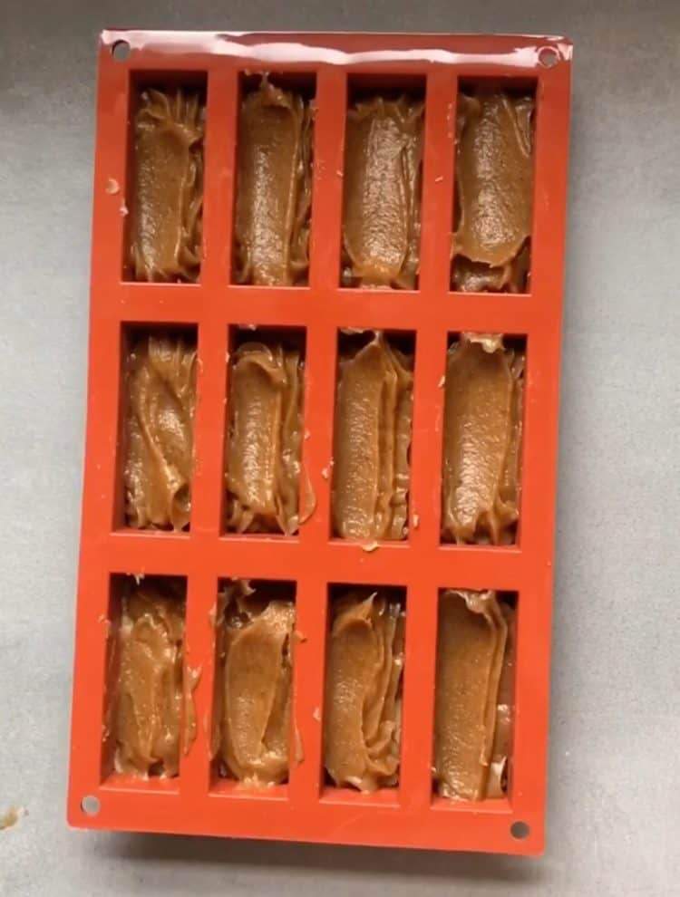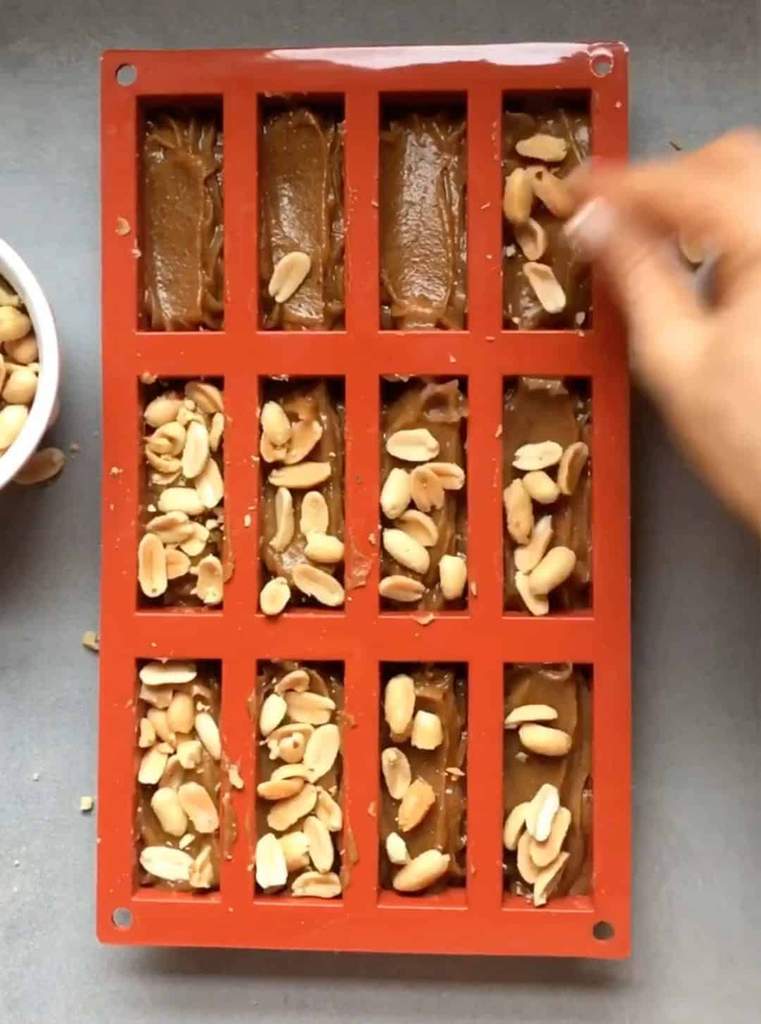 - When making these snickers bars, you can either make them as a 'tray bake' in a large dish and then cut to size or alternatively use a silicone 'bar' mould. If making it in a large dish then simply pour in the nougat base and press lightly, till even. If using a silicone mould then divide the mixture equally between the mold cavities and press down to even out the layer.