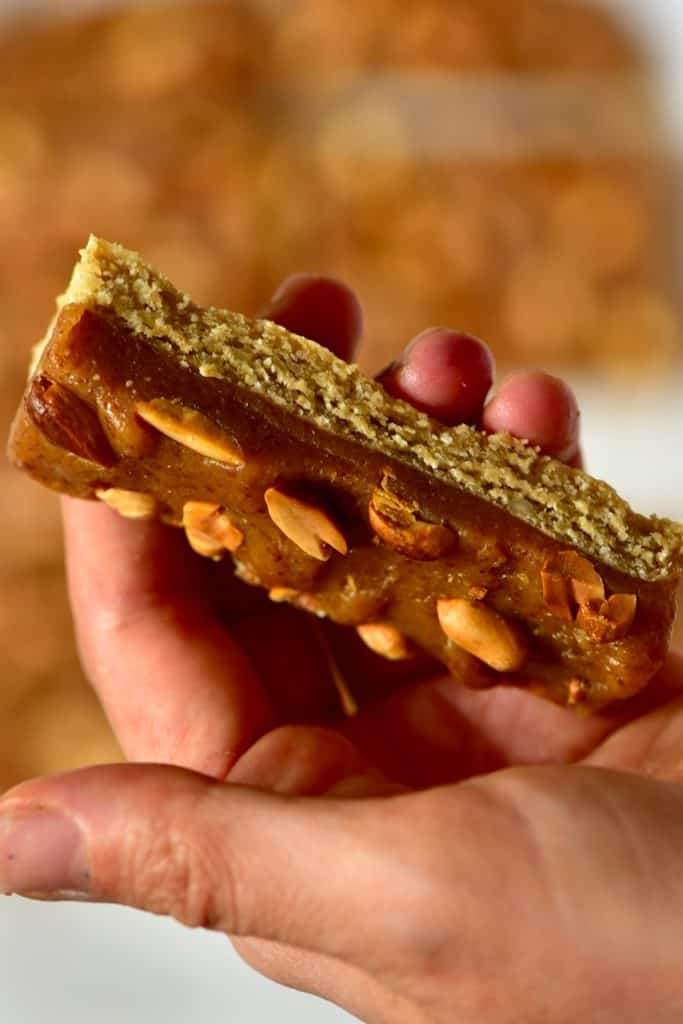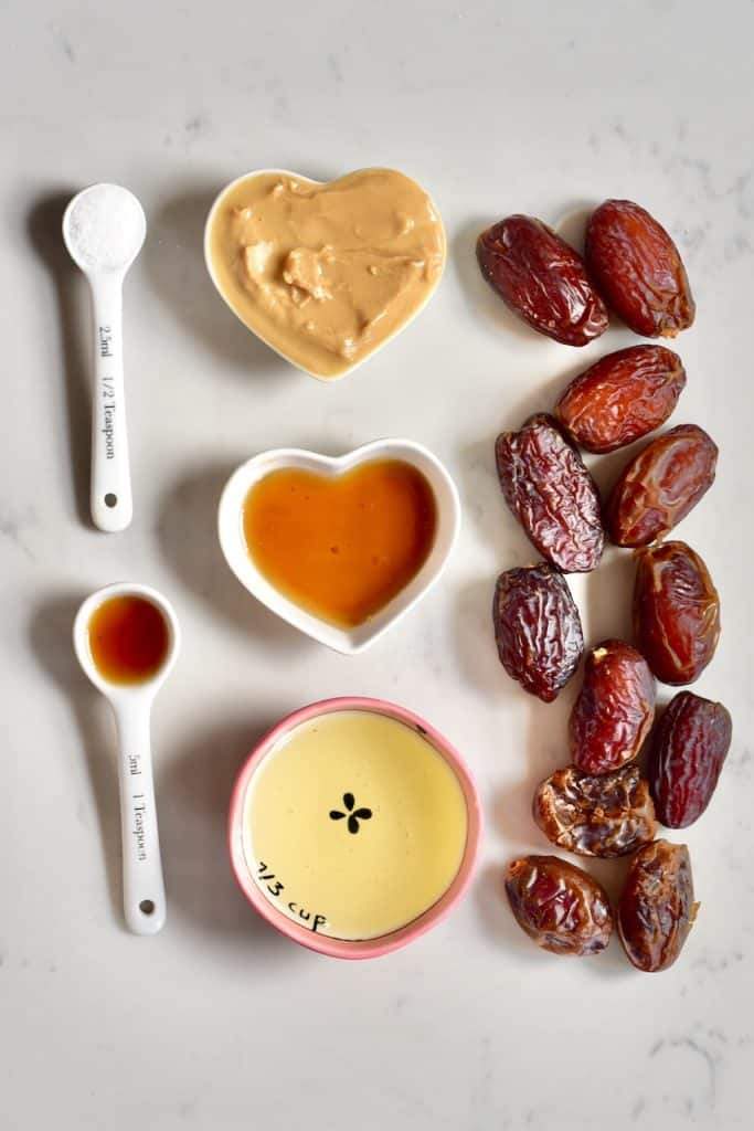 - To prepare the caramel layer, first check the dates. If they feel a bit dry, then soak them in hot water for about ten minutes. This will make for a smoother, creamier caramel.