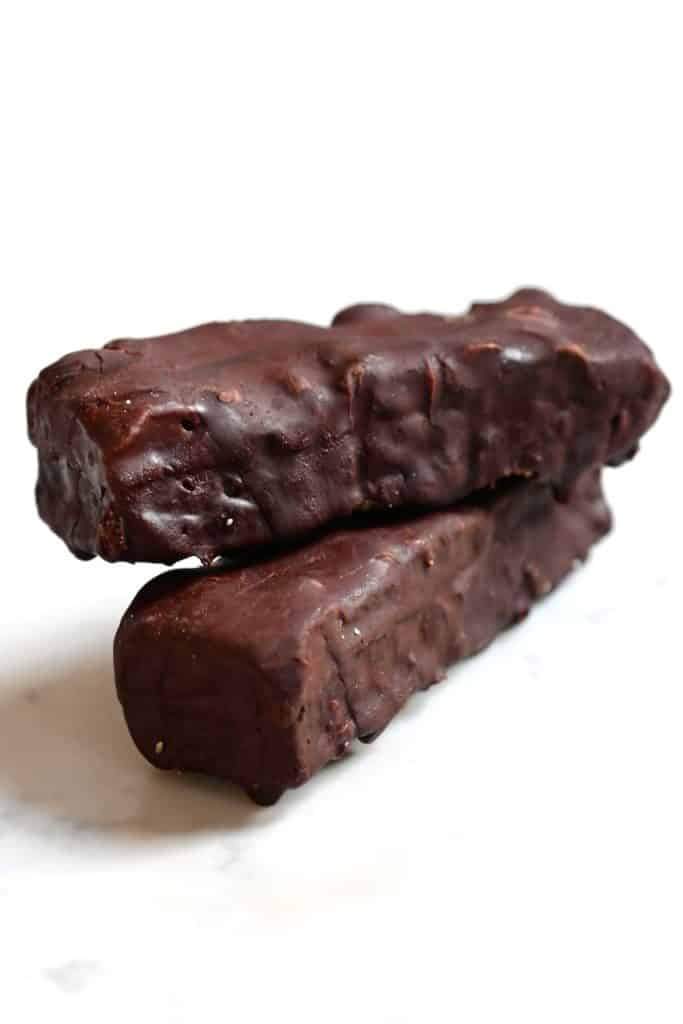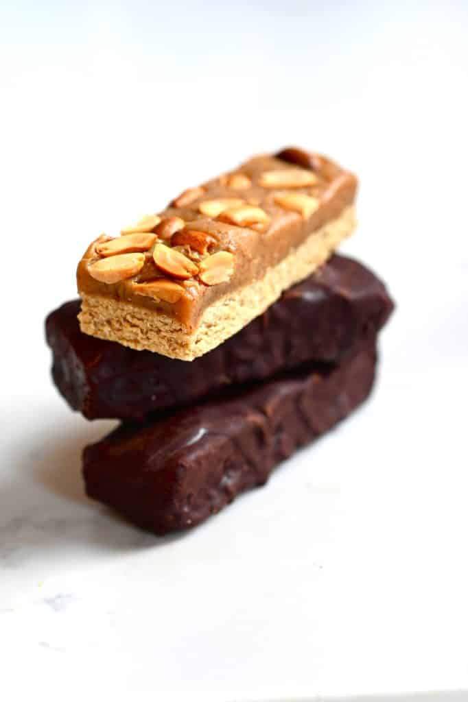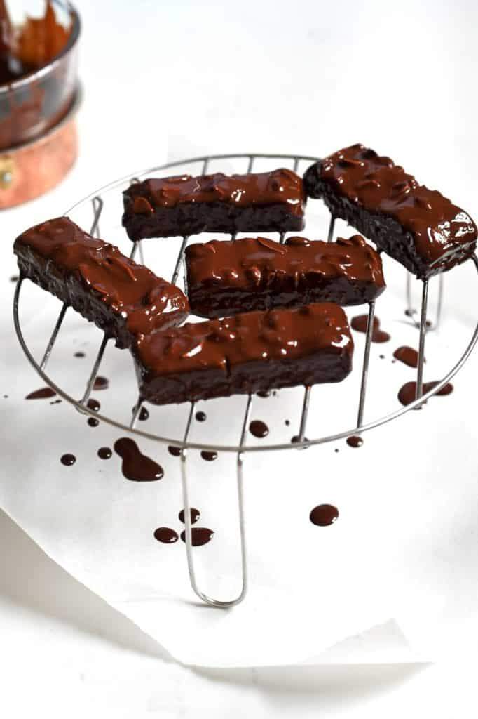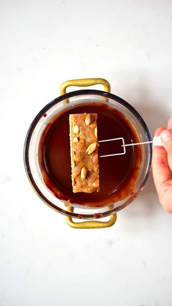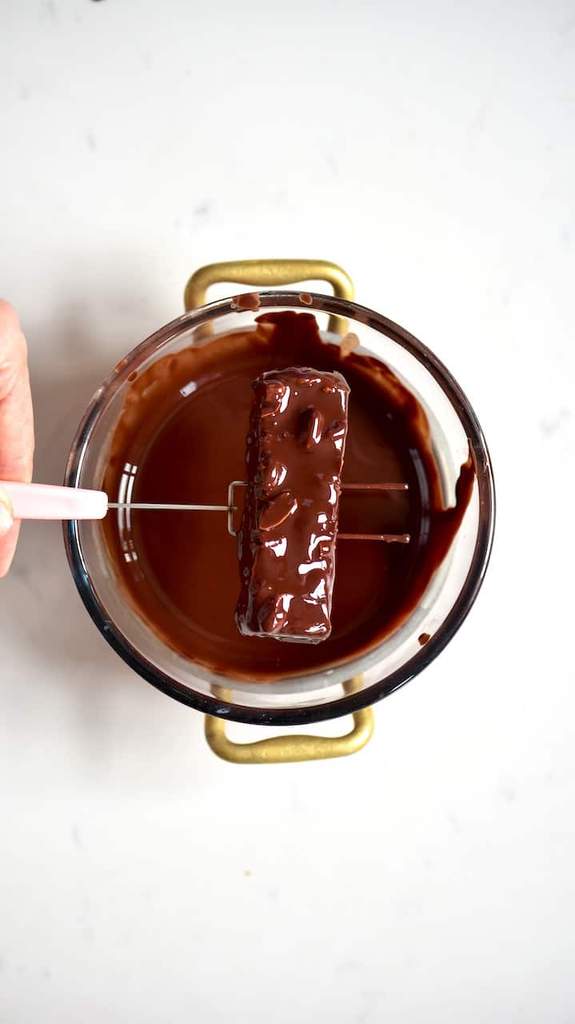 - This part can be messy, so I usually do it on a wire cooling rack and use bbq skewers to press into the bars, to make it easier to dip them. Dip each bar in the melted chocolate and set aside to dry. I like my snickers extra chocolate, so I dipped them twice. This also helps to cover up any bits that may not have been covered the first time.